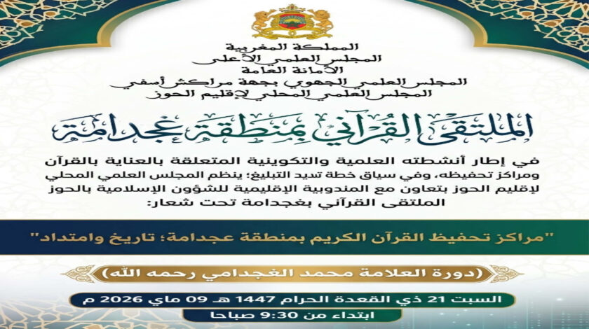 - 09:00المجلس العلمي بالحوز ينظم ملتقى قرآنياً بغجدامة احتفاءً بتاريخ مراكز التحفيظ