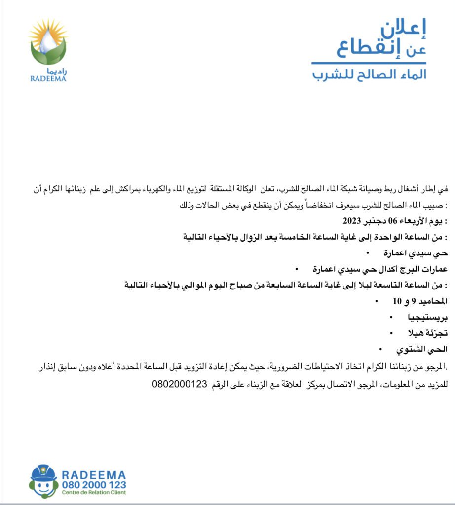 إعلان.. راديما مراكش تعلن عن انقطاع صبيب الماء الصالح للشرب بهذه الاحياء