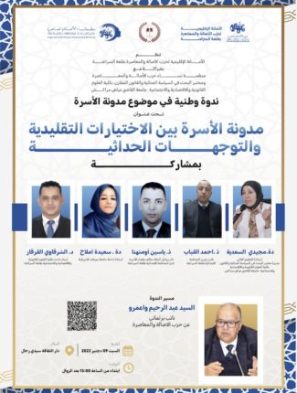 تنظم الأمانة الإقليمية لحزب الأصالة والمعاصرة بقلعة السراغنة، بشراكة مع منظمة نساء الأصالة والمعاصرة، ومختبر البحث في السياسة الجنائية والقانون المقارن بكلية العلوم القانونية والاقتصادية والاجتماعية بجامعة القاضي عياض بمراكش، يوم السبت 9 دجنبر 2023، بدار الثقافة سيدي رحال، ندوة وطنية حول موضوع مدونة الأسرة تحت عنوان: “مدونة الأسرة بين الاختيارات التقليدية والتوجهات الحداثية”، بمشاركة ثلة من الأساتذة والمتخصصين.
