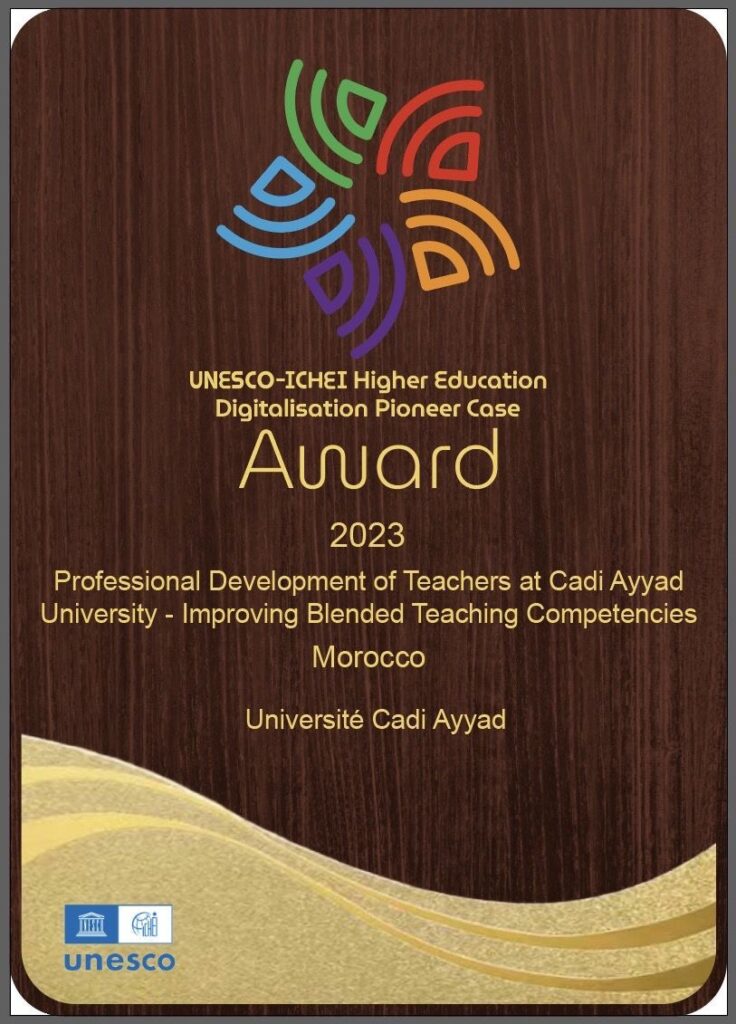 فازت جامعة القاضي عياض (UCA) بجائزة اليونسكو-ICHEI الدولية (HE-DPC) تقديرًا لالتزامها برقمنة التعليم العالي من خلال شهادة الوضع الهجين في أصول التدريس الجامعي. أقيم حفل توزيع الجوائز يوم الخميس 7 ديسمبر 2023 في شنتشن، الصين.