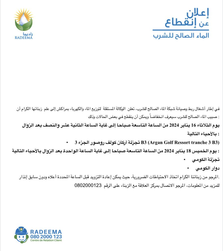 إعلان.. راديما مراكش تعلن عن انقطاع صبيب الماء الصالح للشرب بهذه الاحياء