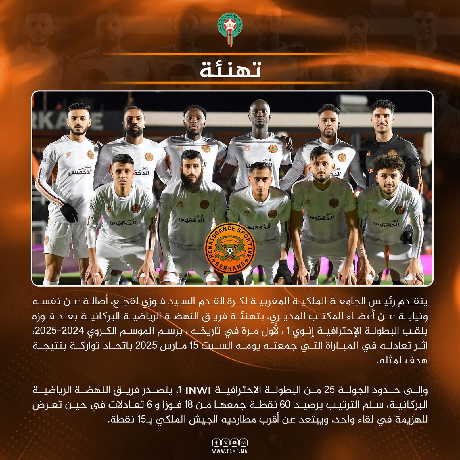 بعث رئيس الجامعة الملكية المغربية لكرة القدم، فوزي لقجع، برقية تهنئة إلى فريق النهضة الرياضية البركانية بمناسبة تتويجه بلقب البطولة الاحترافية إنوي 1 لموسم 2024-2025، وذلك للمرة الأولى في تاريخ النادي.