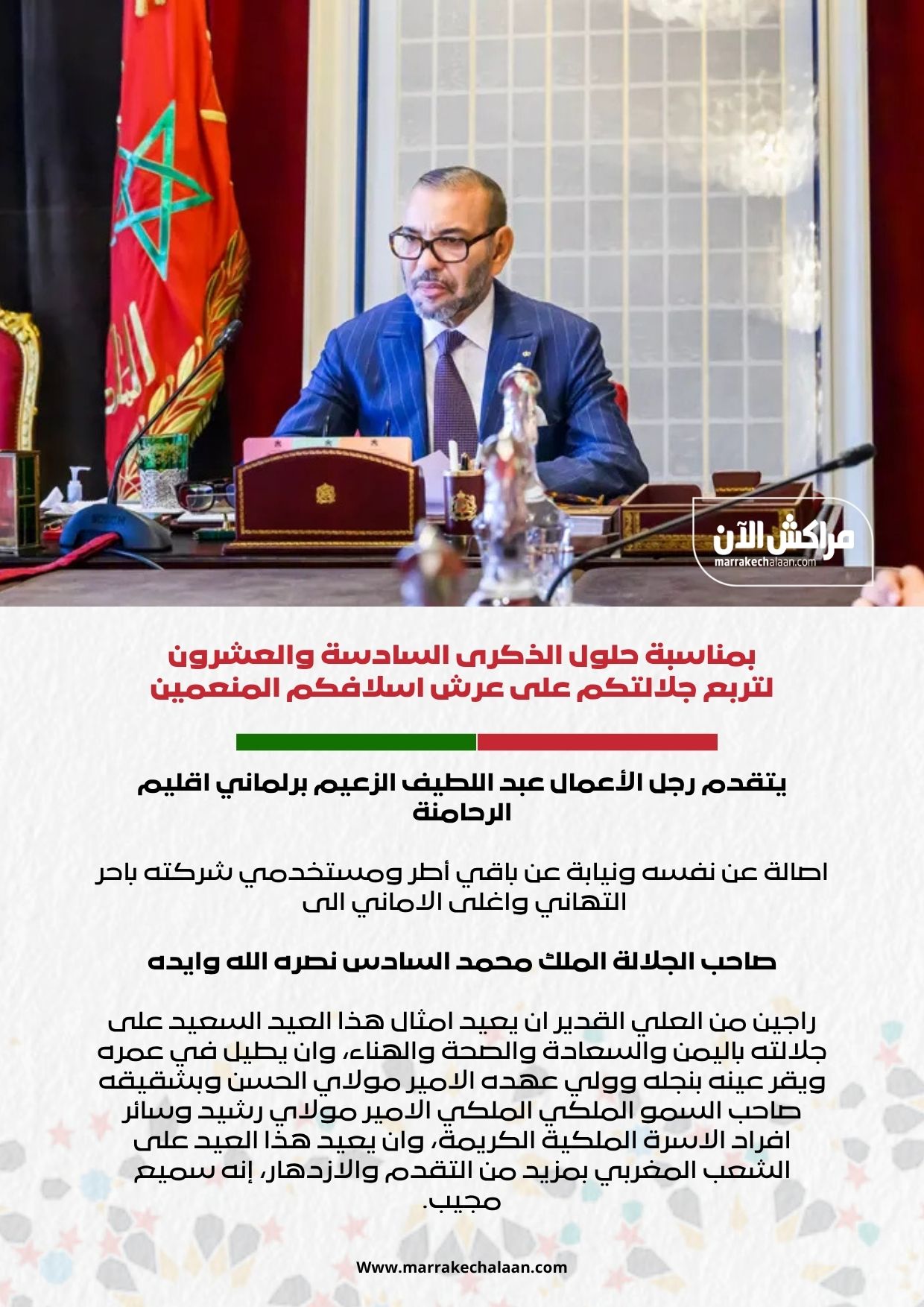 عبد اللطيف الزعيم برلماني اقليم الرحامنة يهنئ جلالة الملك بمناسبة عيد العرش المجيد