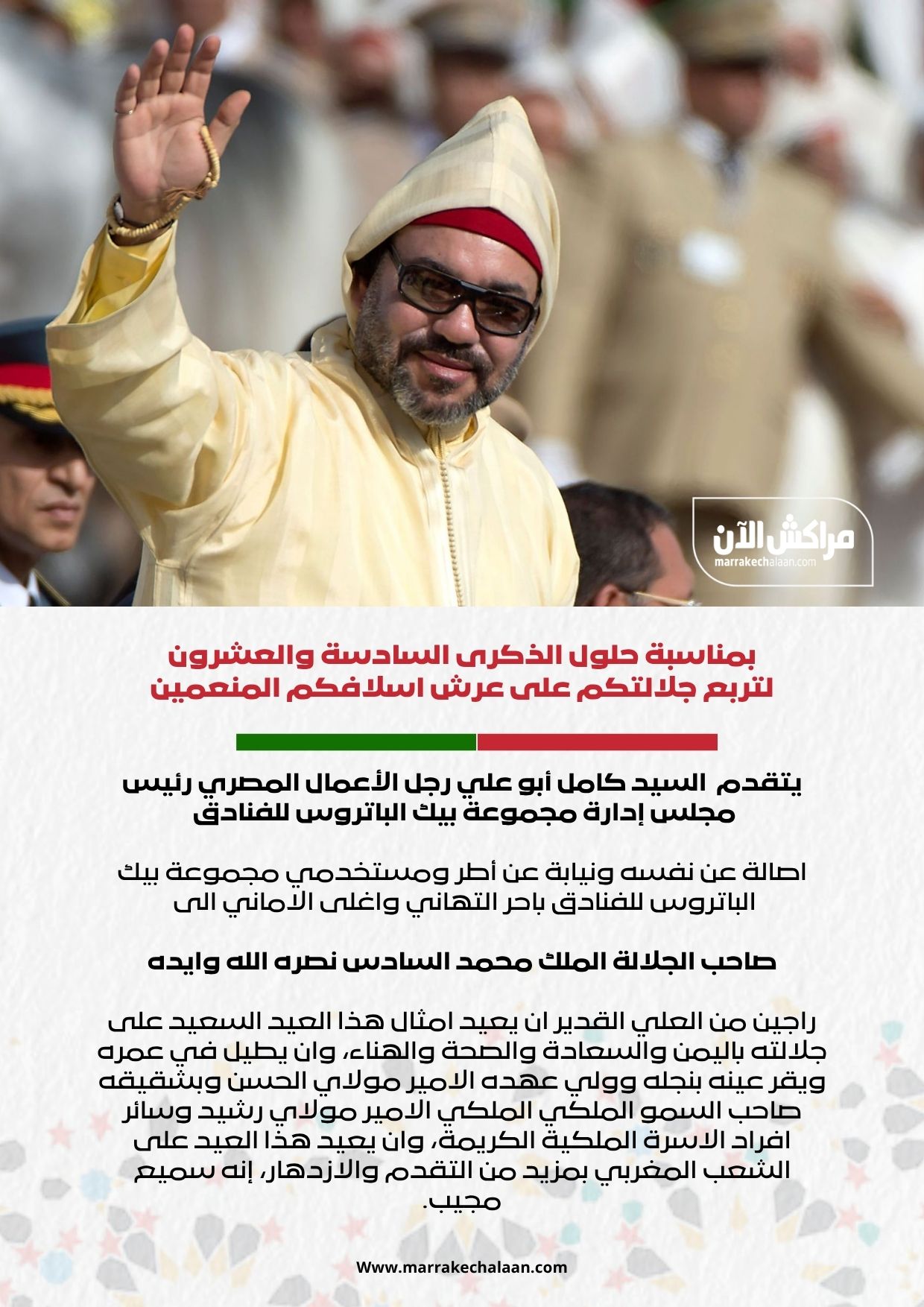 كامل أبو علي رجل الأعمال المصري رئيس مجلس إدارة مجموعة بيك الباتروس للفنادق يهنئ جلالة الملك بمناسبة عيد العرش المجيد