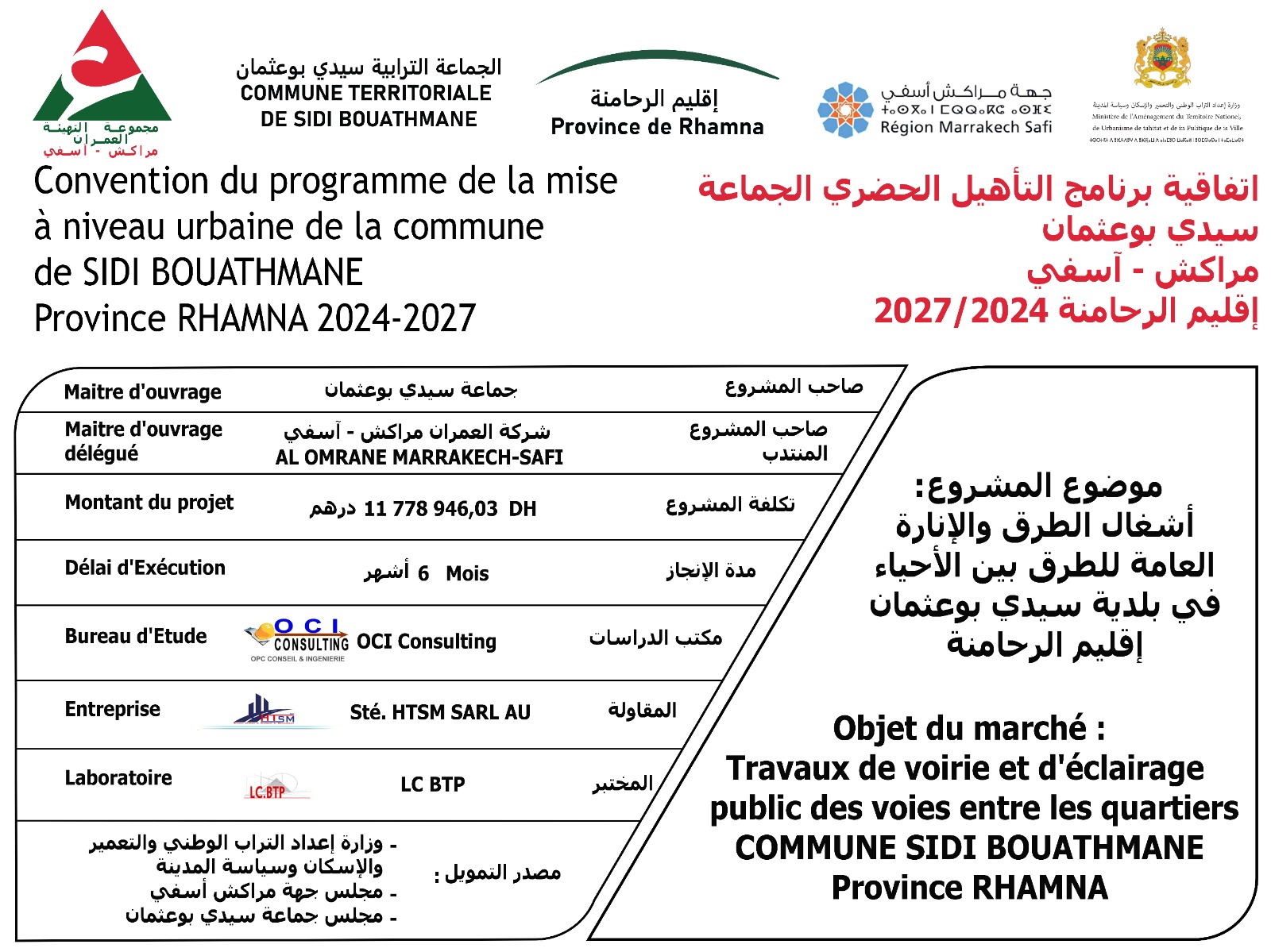 يُنجز المشروع من طرف المجلس الجماعي لسيدي بوعثمان بصفته صاحب المشروع، بغلاف مالي إجمالي قدره 11,778,946.00 درهم، ومدة إنجاز محددة في سنة واحدة، في إطار رؤية متكاملة لجعل المدينة أكثر تنظيماً وتوازناً عمرانياً.
