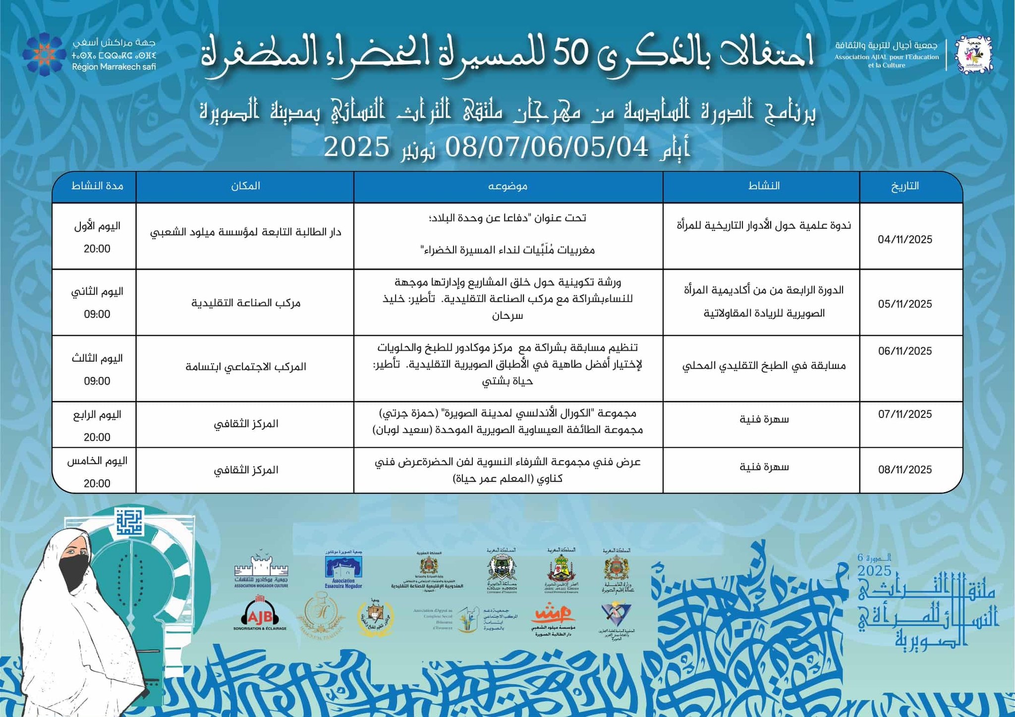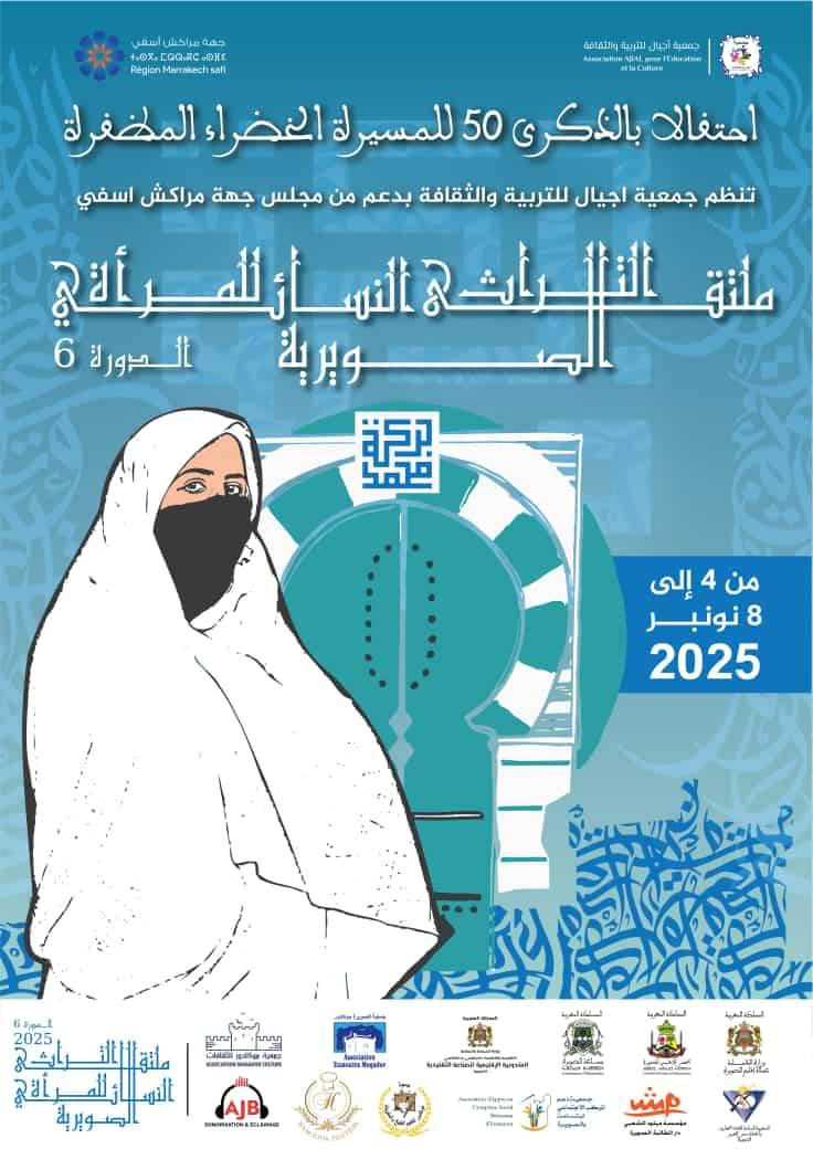 تنظم جمعية أجيال للتربية والثقافة بدعم من مجلس جهة مراكش ـ آسفي فعاليات ملتقى التراث النسائي بالصويرة في نسخته السادسة، وذلك خلال الفترة الممتدة من 4 إلى 8 نونبر 2025 بمدينة الصويرة، وذلك بمناسبة الذكرى الخمسين للمسيرة الخضراء.