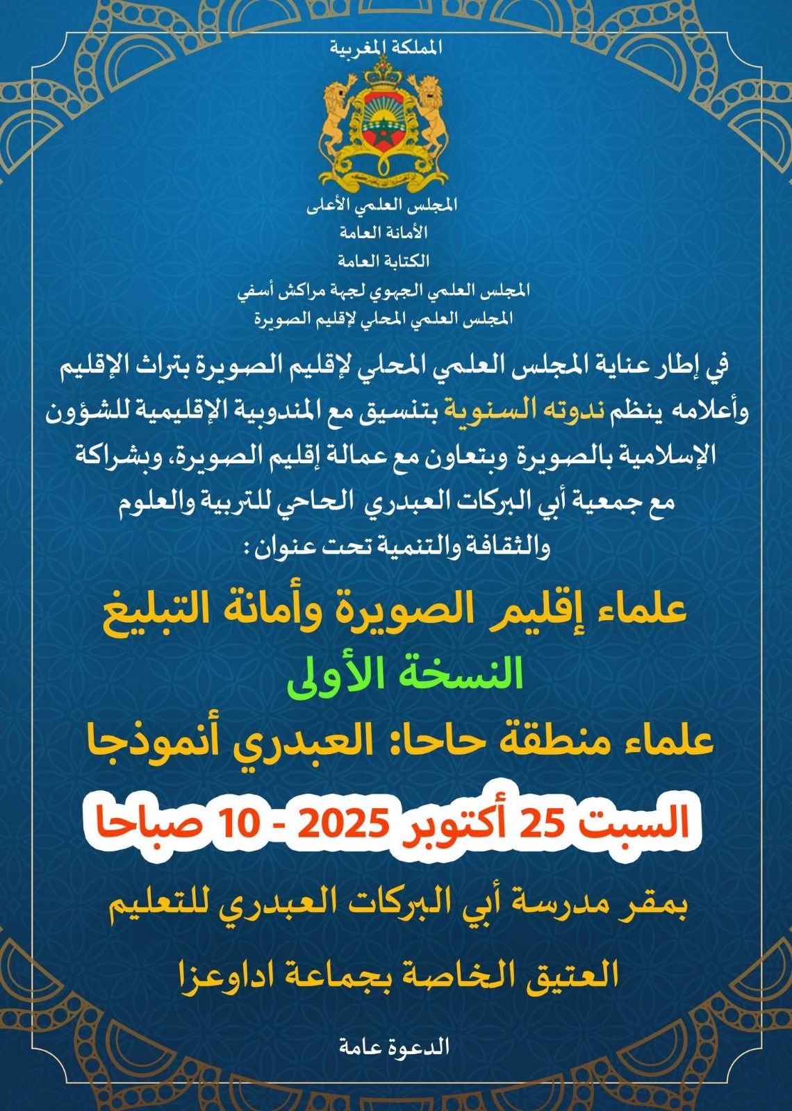 ينظم المجلس العلمي المحلي لإقليم الصويرة، الذي يرأسه، محمد منكيط، صباح يومه السبت 25 أكتوبر، ندوة علمية سنوية تحت عنوان “علماء إقليم الصويرة وأمانة التبليغ” النسخة الأولى: علماء منطقة حاحا – العبدري أنموذجًا.