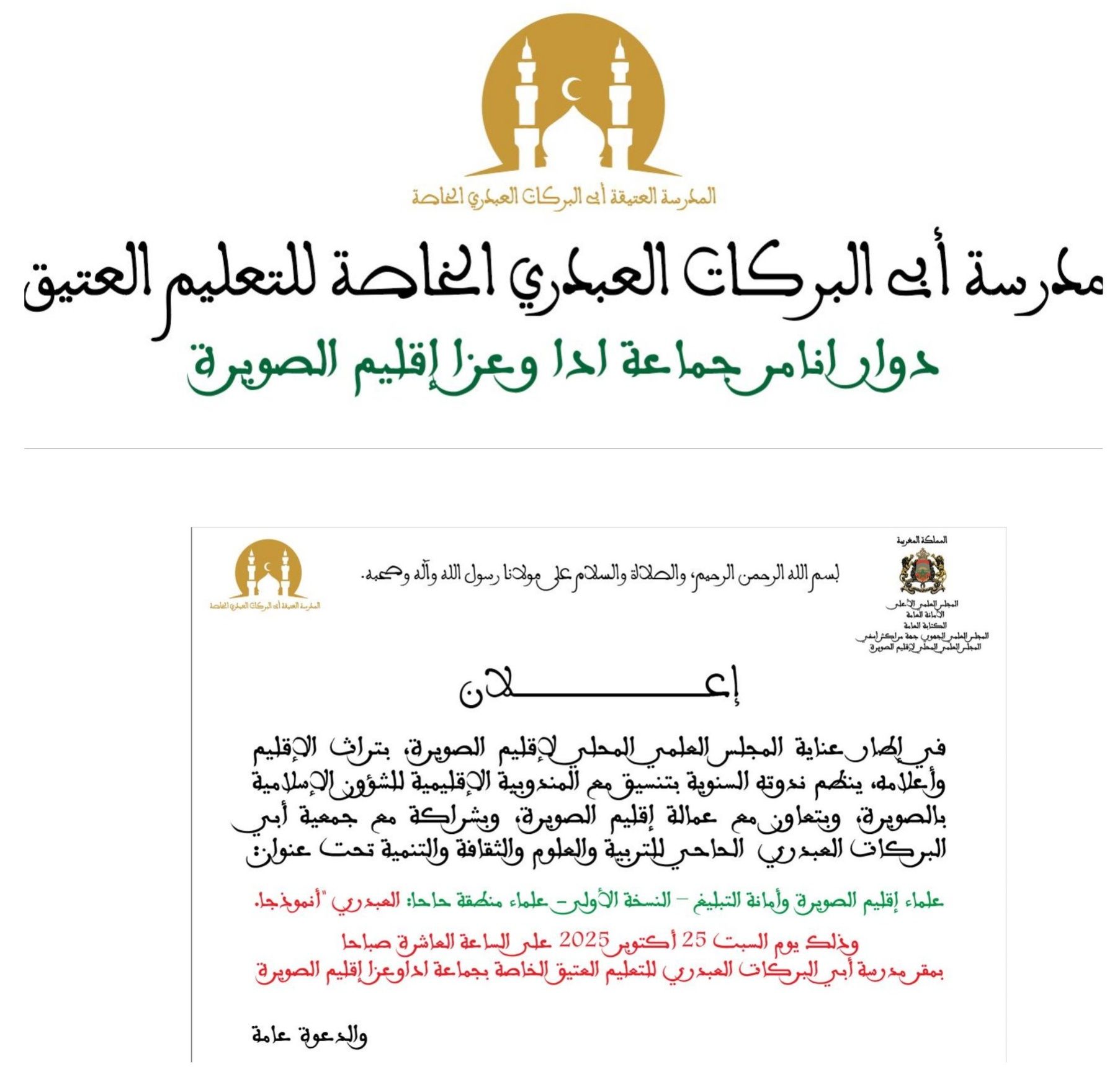 وجاء عقد هذا اللقاء العليمي، الذي تحتضن فعالياته مدرسة أبي البركات العبدري الخاصة للتعليم العتيق، بجماعة إداو عزا، إقليم الصويرة، في إطار العناية التي يوليها المجلس العلمي المحلي لإقليم الصويرة بتراث الإقليم العلمي والروحي، وإحياءً لذكر أعلامه ورجالات الفكر والدعوة.