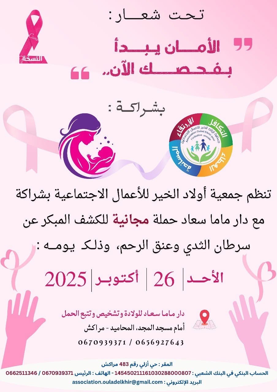 “الأمان يبدأ بفحصك الآن”.. جمعية أولاد الخير تطلق حملة مجانية للكشف المبكر عن سرطان الثدي وعنق الرحم بمراكش