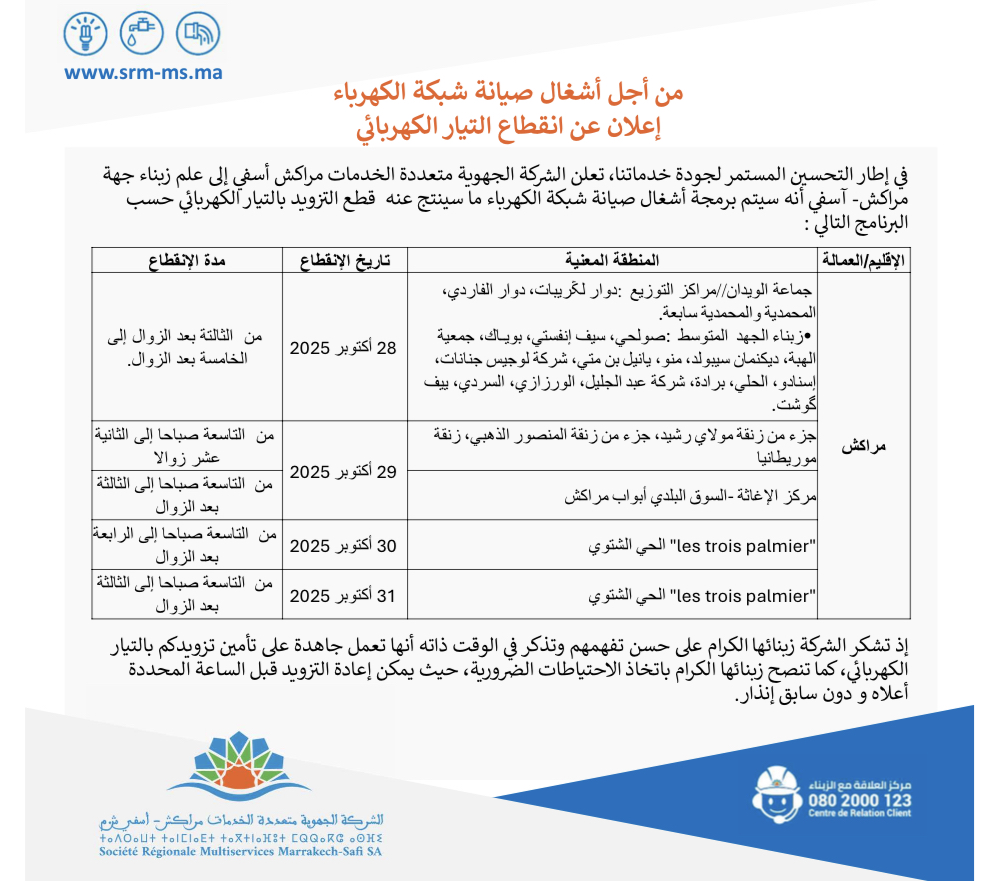 إعلان.. الشركة الجهوية متعددة الخدمات تعلن عن انقطاع التيار الكهربائي بسبب اشغال الصيانة بهذه الاحياء بمراكش