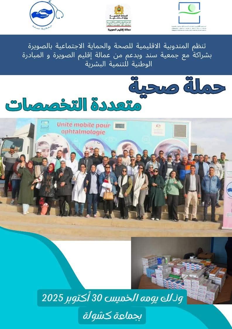 وتُنظم هذه القافلة الصحية من طرف المندوبية الإقليمية لوزارة الصحة والحماية الاجتماعية بالصويرة، بشراكة مع جمعية سند لدعم القطاع الصحي العمومي، وبدعم من عمالة إقليم الصويرة والمبادرة الوطنية للتنمية البشرية.