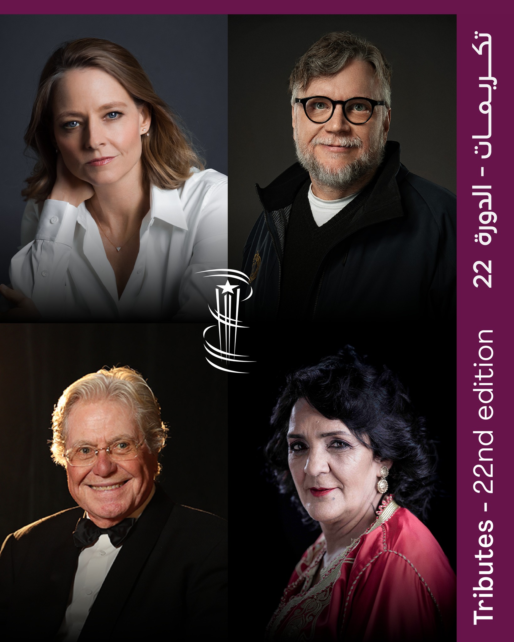 وفي دورته الثانية والعشرين، يحتفي المهرجان الدولي للفيلم بمراكش بأربع شخصيات بارزة تعكس مساراتهم الفنية اللامعة غنى وتنّوع الفن السابع: جودي فوستر، غييرمو ديل تورو، راوية، وحسين فهمي. فنانون من آفاق مختلفة، يجّسد كٌّل منهم بطريقته الخاصة قوة السينما وبعدها الكوني.