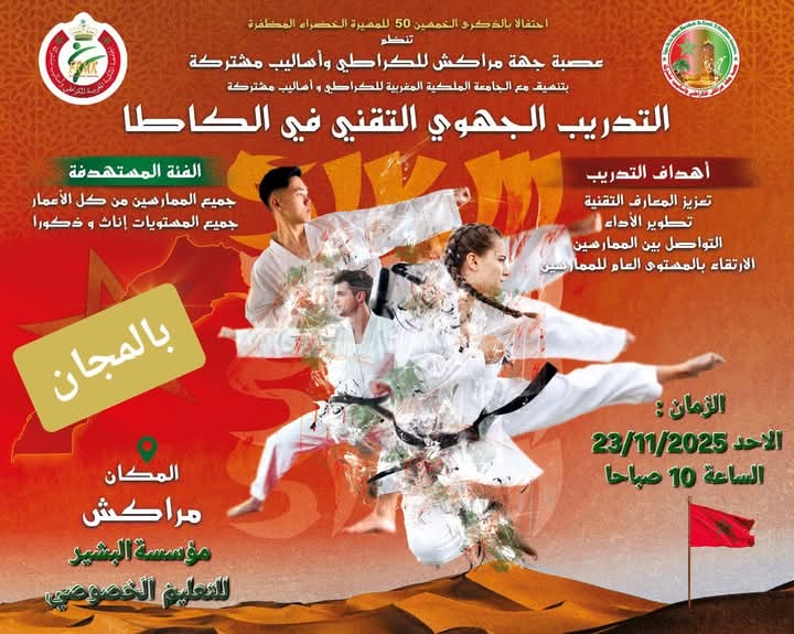 يُقام هذا التدريب الهام اليوم، الأحد 23 نونبر 2025، ابتداءً من الساعة العاشرة صباحاً (10:00 صباحاً)، بمؤسسة البشير للتعليم الخصوصي بمدينة مراكش، ليكون محطة لجمع المهتمين وتطوير مهاراتهم في فنون الكاراتيه.