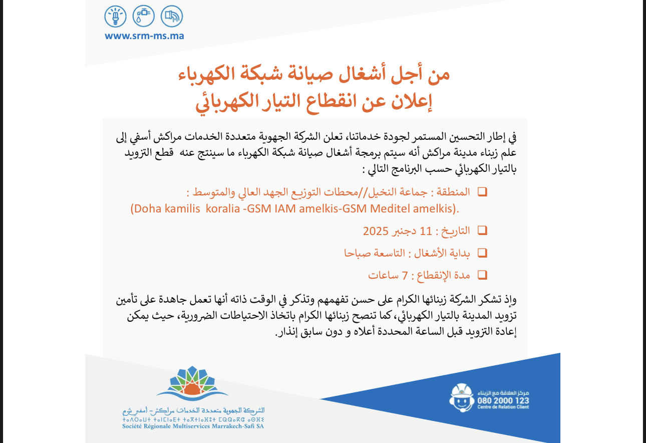 إعلان.. انقطاع التيار الكهربائي بسبب اشغال الصيانة بهذه الاحياء بمراكش