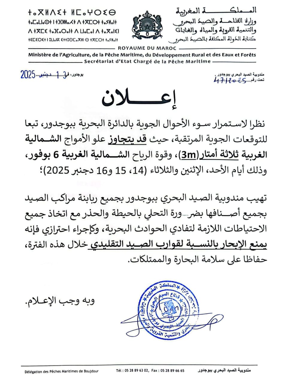 يذكر أن مندوبية الصيد البحري ببوجدور، قد أعلنت منذ يوم الخميس، عن منع الإبحار في وجه قوارب الصيد التقليدي ، كإجراء احترازي في ظل الظروف الجوية المضطربة غير المساعدة على الإبحار التي تطبع السواحل المحلية، خصوصا وعلو الأمواج الذي قد يتجاوز مترين، مع تسجيل قوة رياح شمالية غربية إلى شمالية شرقية تصل إلى 6 بوفور، وذلك خلال أيام الخميس والجمعة والسبت (11 و12 و13 دجنبر 2025). وهو الإعلان الذي تم تحيينه بتمديد المنع في وجه الصيد التقليدي إلى غاية يوم 16 من الشهر الجاري.