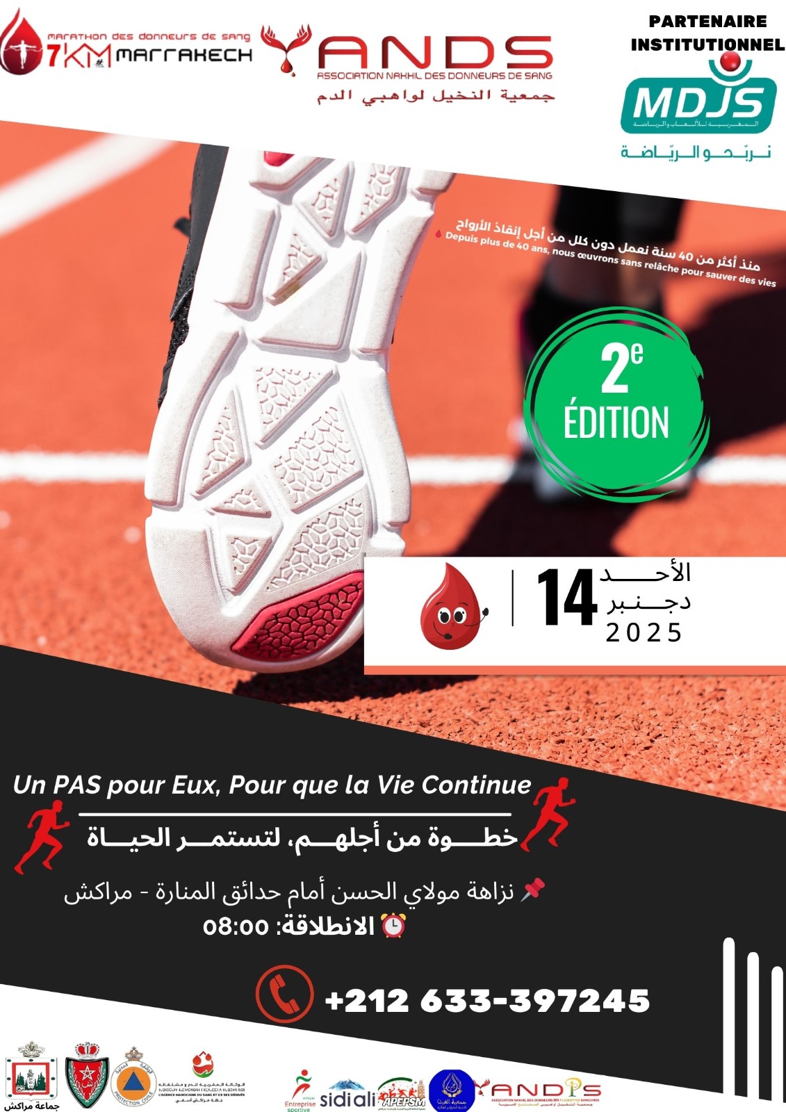 ونُظم الماراثون تحت شعار “خطوة من أجلهم، لتستمر الحياة” (Un PAS pour Eux, Pour que la Vie Continue)، بهدف التوعية بأهمية التبرع بالدم وتعزيز المخزون الوطني منه، وهو التزام تواصله الجمعية لأكثر من 40 عاماً في خدمة إنقاذ الأرواح.