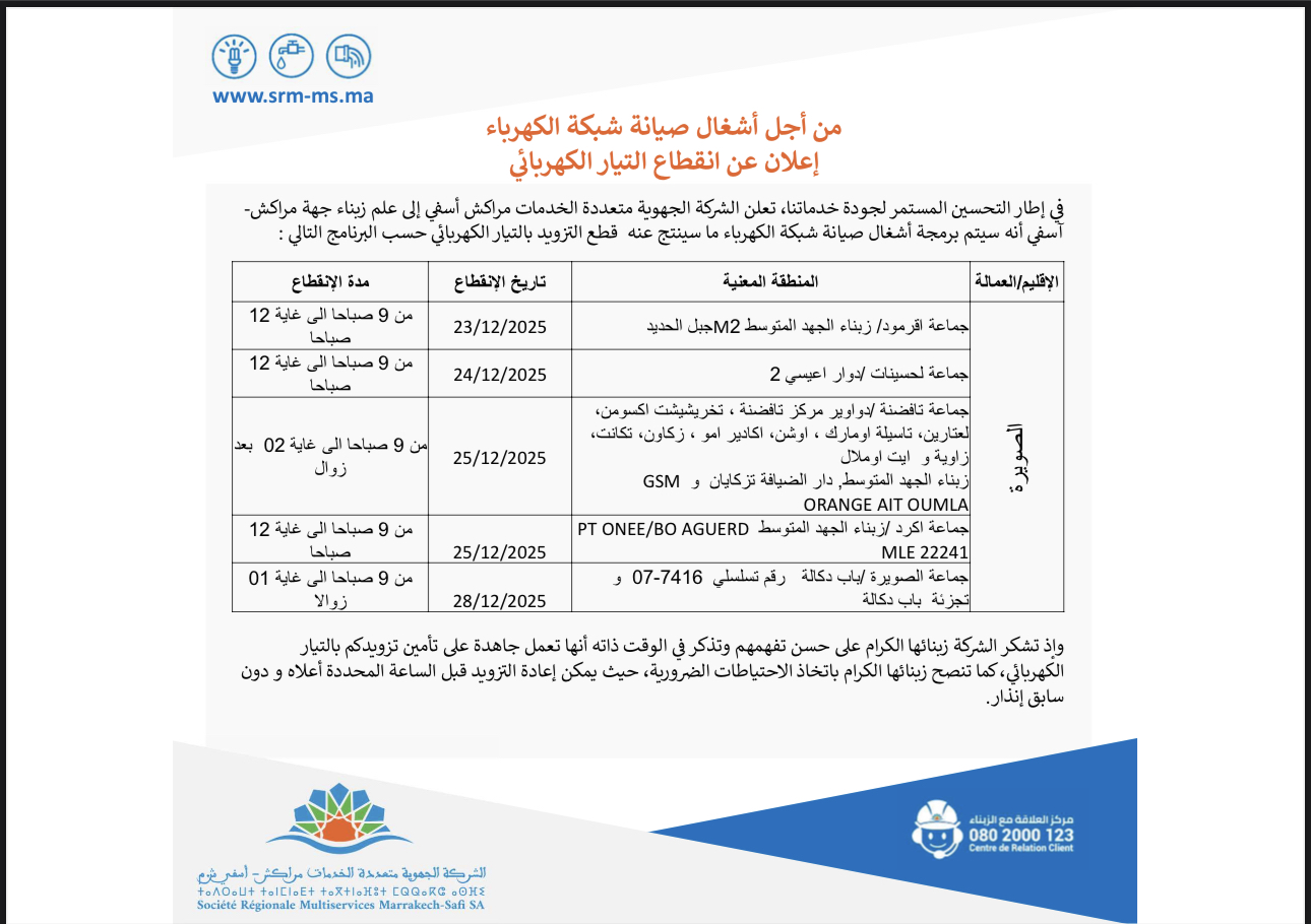 إعلان.. انقطاع التيار الكهربائي بسبب اشغال الصيانة بهذه المناطق بإقليم الصويرة