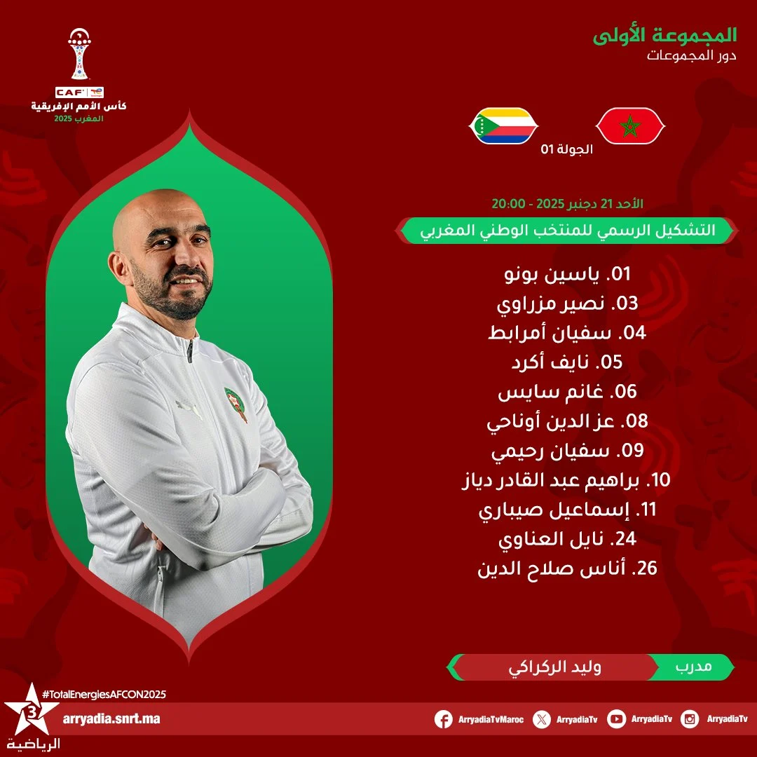كشف الناخب الوطني وليد الركراكي التشكيلة الرسمية للاعبي المنتخب المغربي التي قرر الاعتماد عليها في مباراة أمام جزر القمر، الأحد 21 دجنبر 2025، برسم افتتاح نهائيات كأس أمم إفريقيا “كان المغرب 2025”.