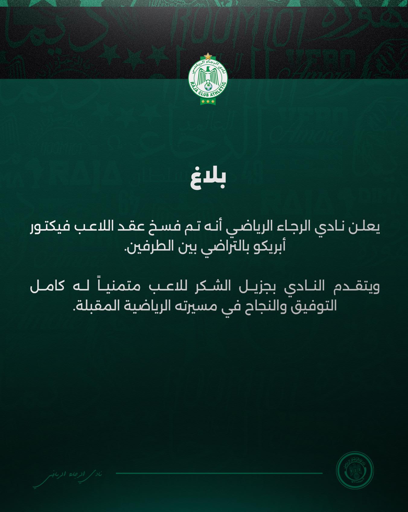 أعلن نادي الرجاء الرياضي لكرة القدم أنه قد “تم فسخ عقد اللاعب فيكتور أبريكو بالتراضي بين الطرفين”.