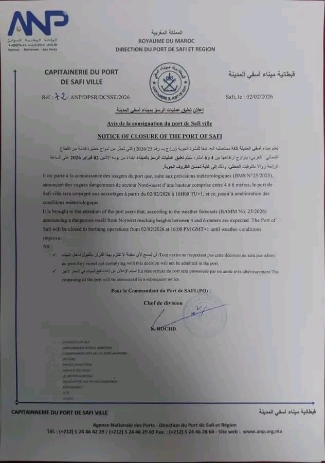 هذا وشددت قبطانية ميناء آسفي على أن أي سفينة لا تحترم هذا القرار لن يُسمح لها بولوج الميناء، مؤكدة أن استئناف النشاط الملاحي سيخضع لتقييم دقيق للوضعية البحرية والمناخية.