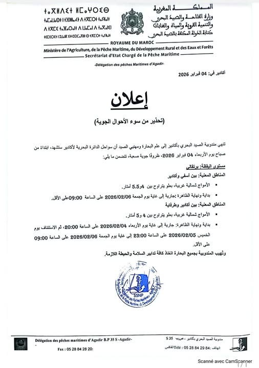 أصدرت مندوبية الصيد البحري بأكادير إعلانا تحذّر من خلاله من سوء الأحوال الجوية المرتقب بالسواحل التابعة لنفوذها، حيث دعت مهنيي الصيد البحري إلى توخي أقصى درجات الحيطة والحذر.