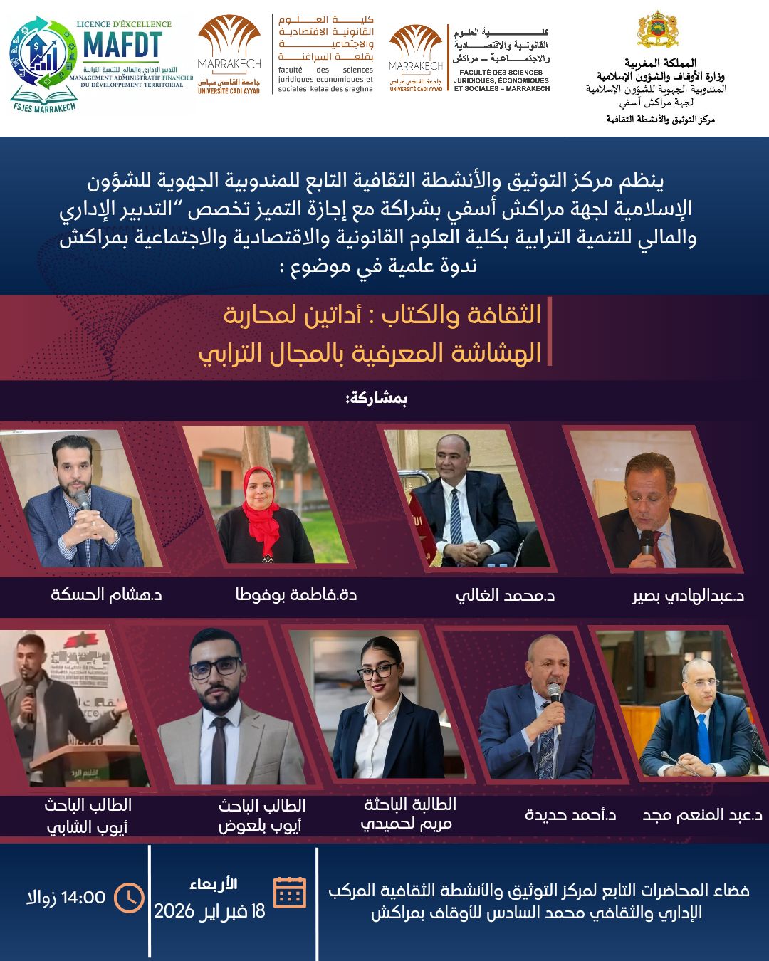ويتم تنظيم هذه اللقاء العلمي بشراكة مع إجازة التميز تخصص “التدبير الإداري والمالي للتنمية الترابية” بكلية العلوم القانونية والاقتصادية والاجتماعية بمراكش، بقاعة الندوات التابعة لمركز التوثيق والأنشطة الثقافية بالمركب الإداري والثقافي محمد السادس للأوقاف بمراكش.