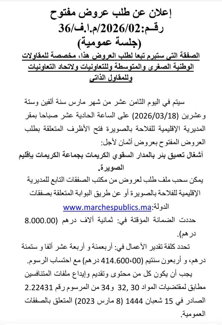 أعلنت المديرية الإقليمية للفلاحة بالصويرة عن طلب عروض مفتوح رقم 36/م.ف/2026، في إطار جلسة عمومية، وذلك من أجل إنجاز أشغال تعميق بئر بالمدار السقوي الكريمات بجماعة الكريمات، إقليم الصويرة.