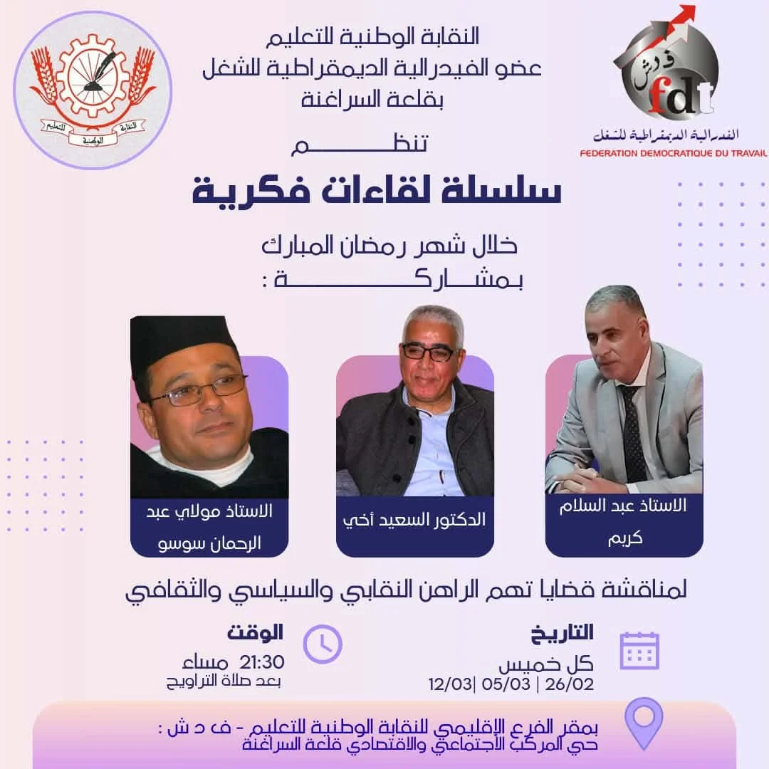 أعلن الفرع الإقليمي للنقابة الوطنية للتعليم، المنضوي تحت لواء الفيدرالية الديمقراطية للشغل بقلعة السراغنة، عن تنظيم برنامج فكري حافل خلال شهر رمضان المبارك، يضم سلسلة من اللقاءات التواصلية المخصصة لمقاربة الراهن النقابي والسياسي والثقافي ببلادنا.
