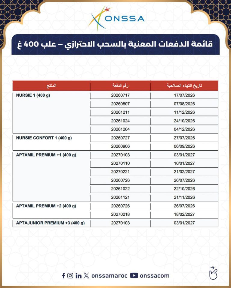 وأكد مكتب “أونسا” أن عمليات السحب والإرجاع لاتزال متواصلة حتى إتمامها بالكامل، كما سيتم إتلاف جميع حصص حليب الرضع موضوع هذا الإشعار، مشيرا إلى أن رقم الدفعة مطبوع مباشرة على الجانب الخارجي او أسفل علبة الحليب، ويتكون من 8 أرقام تبدأ بـ 2026 أو 2027.