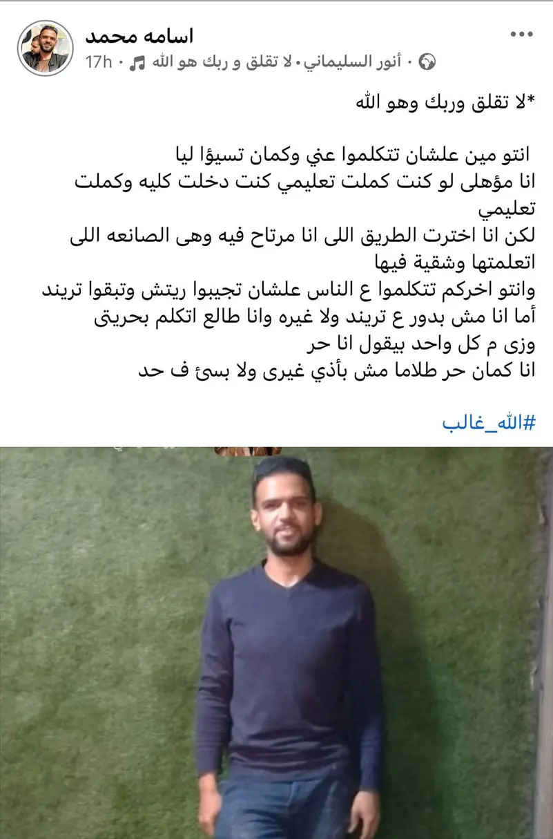 واتهم أسامة محمد منتقديه بالبحث عن الترند والشهرة، وأضاف: “أنا مش بدور على ترند ولا غيره، أنا طالع أتكلم بحريتي، وزى ما كل واحد بيقول أنا حر، أنا كمان حر طالما أنني لا أؤذي غيري ولا أسيء لأحد”.