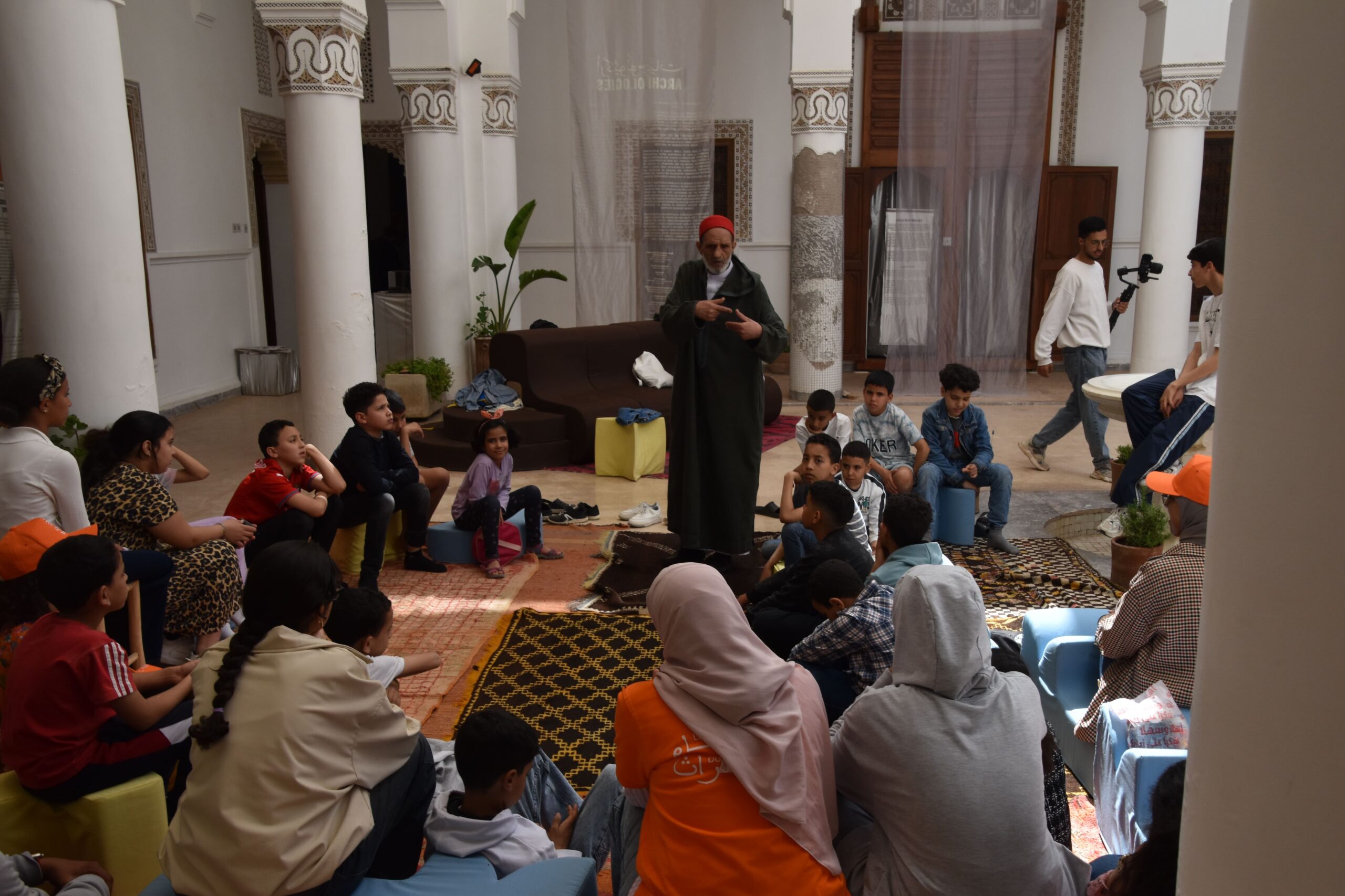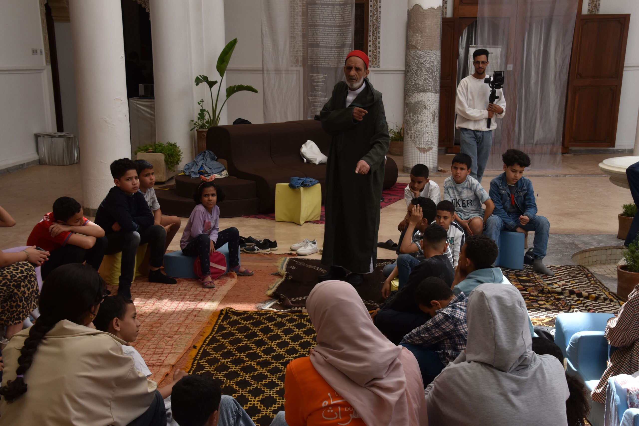 واستُهلت الأنشطة بجلسات للحكي تحاكي فن “الحلقة” الذي تتميز به ساحة جامع الفنا، لربط الأطفال بذاكرة المدينة الشفهية داخل فضاء “دار بلارج” التاريخي.