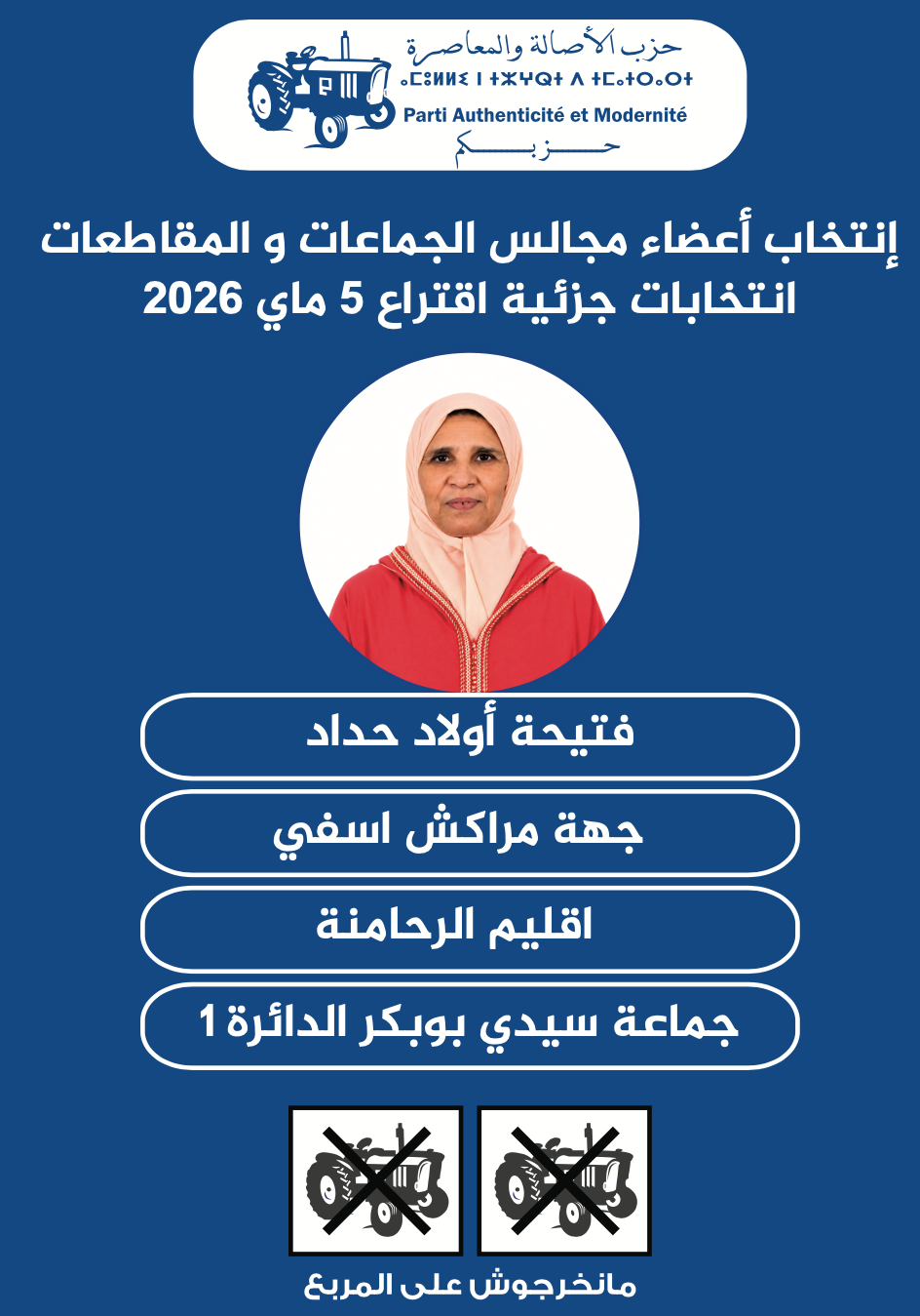 وبحسب الوثائق التعريفية للمرشحين، فقد زكى الحزب العربي الراجي لخوض المنافسة بالدائرة الانتخابية رقم 7 التابعة لجماعة سيدي عبد الله، فيما تمت تزكية فتيحة أولاد حداد كمرشحة عن الدائرة الانتخابية رقم 1 بجماعة سيدي بوبكر، للمنافسة على المقاعد المخصصة لمجالس الجماعات والمقاطعات في هذا الاستحقاق الجزئي.