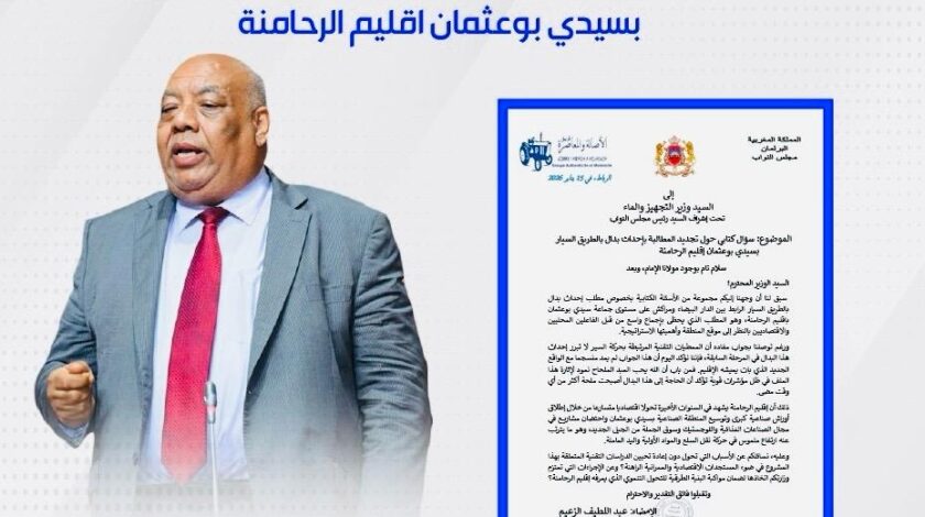 16 يناير 2026وجّه النائب البرلماني عبد اللطيف الزعيم سؤالا كتابيا إلى نزار البركة، وزير التجهيز والماء، بشأن تجديد المطالبة باحداث بدال بالطريق السيار بسيدي بوعثمان باقليم الرحامنة. وأشار برلماني إقليم الرحامنة انه سبق ان راسل الوزارة عبر مجموعة من الاسئلة الكتابية بخصوص مطلب احداث بدال بالطريق السيار الرابط بين الدار البيضاء ومراكش على مستوى جماعة سيدي بوعثمان […]